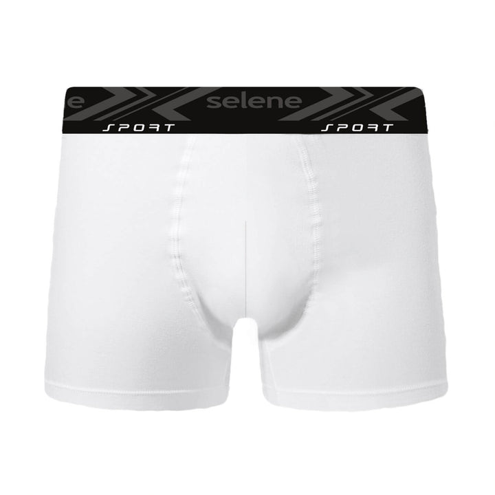 Cueca Boxer Selene Sport Algodão com Bojo Branca. Cueca Boxer lisa com elástico de 35mm, com detalhes em chumbo e escrito Selene Sport.