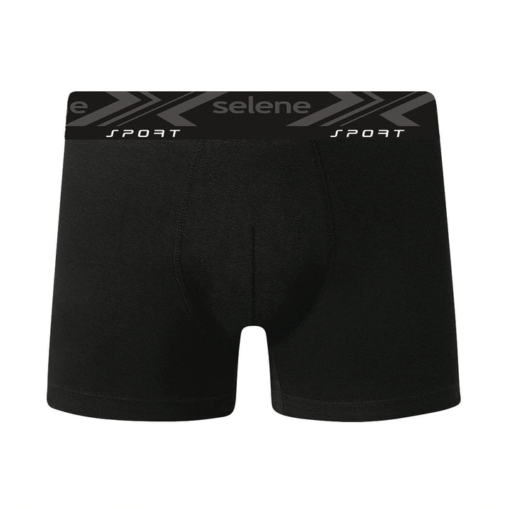 Cueca Boxer Selene Sport Algodão com Bojo Preta. Cueca Boxer lisa com elástico de 35mm, com detalhes em chumbo e escrito Selene Sport.